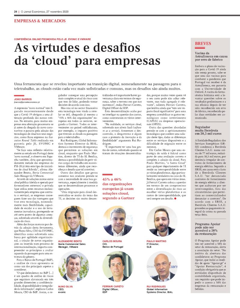 Confira o artigo de cobertura da Executive Round Table sobre Hybrid Cloud que decorreu na passada quinta-feira (27 de Novembro) com a parceria EVONIC e VMware e moderação do Jornal Económico!